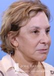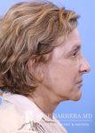 Next the right facelift incision was made. A subcutaneous flap was elevated, superficial to the great auricular nerve which was identified and preserved. The flap was connected to the plane developed in the neck. The subcutaneous flap was then elevated medially up to a line drawn from the lateral canthus to the angle of the mandible. At this point, the deep plane was entered. The SMAS was sharply incised and a subSMAS plane was developed. The zygomaticus major muscle was identified and care was taken to only dissect superficial to the muscle to protect branches of the facial nerve. The SMAS flap was further elevated medially and inferiorly to include the platysma. The flap was incised horizontally, parallel to the body of the mandible to allow for more mobility. Fat over the sternocleidomastoid was then excised to reduce bulk. The inferior portion of the SMAS flap was advanced posteriorly and secured to the mastoid periosteum with 3-0 PDS. Cervicocutaneous retaining ligament was also released and then secured posteriorly with 3-0 PDS. This created a well defined jawline. Fat was advanced along with this flap to allow for gonion augmentation. The superior portion of the flap was advanced superiorly and secured to the pre-auricular SMAS and fascia with 3-0 PDS. The area was inspected for any bleeding and careful hemostasis obtained. Excess skin was then carefully trimmed to ensure there was no tension on the final closure. The tragal skin was thinned. The same procedure was performed on the left face.